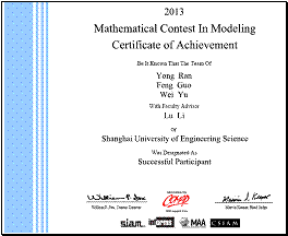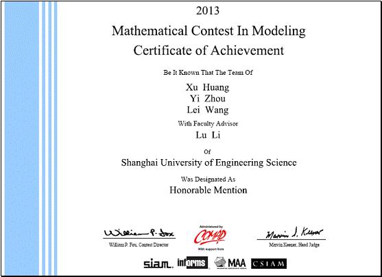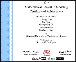 在2月1日至2月5日举行的2013年美国大学生数学建模竞赛暨交叉学科数学建模竞赛(MCM/ICM)中,我校基础教学学院教练组指导的3支参赛队全部获奖,由材料工程学院学生黄旭、周轶、王磊组成的参赛队获二等奖(Honorable Mention),由汽车工程学院学生于玮、郭凤、冉勇组成的参赛队和化学化工学院学生郭鑫、李光明、郭丽蓉分获三等奖(Successful Participant)。 MCM/ICM(Mathematical Contest in Modeling和 Interdisciplinary Contest in Modeling的缩写,即“数学建模竞赛”和“交叉学科建模竞赛”)是由美国自然基金协会、美国数学学会、美国工业与应用数学学会、美国国家安全局联合举办的国际性大学生数学建模竞赛,MCM始于1985年,ICM始于2000年。由COMAP( the Consortium for Mathematics and Its Application,美国数学及其应用联合会)主办。竞赛以三人为一组,在四天时间内,就指定的问题完成从建模、求解、验证到论文撰写的全部工作。今年有14个国家和地区的5636支参赛队参加该项比赛,美国以外的参赛队超过90%,是国际大学生各类竞赛中级别最高的一项赛事,每年吸引世界著名高校参赛,享有国际数学建模竞赛盛会的美誉,很多国内外著名科研机构和企业将其作为衡量学生素质和水平的重要依据。 在校领导和教务处领导的亲切关怀下,在材料工程学院、汽车工程学院和化学化工学院的大力配合下,基础教学学院精心部署,数学教研室选派骨干教师担任指导教师认真组织赛前培训。3支参赛队全部由2012年全国大学生数学建模竞赛获奖队参赛选手组成。由于美国数学建模培训及竞赛正值寒假,为了在赛前给全体参赛队员以耐心细致的辅导,参加培训的指导老师和同学克服诸多困难,放弃了休息时间,力求获得良好成绩,为校争光。这次国际大赛提高了学生的数学建模能力,特别是在用英文写作方面有了大幅度的进步。希望我校能有更多同学参与到这项赛事中来,并在今后的竞赛中取得更优异的成绩,提高我校的国际知名度!