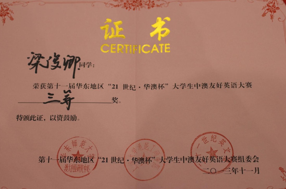 “华澳杯”是由21世纪英文报、澳大利亚外交贸易部澳中理事会、澳大利亚驻上海总领事馆等机构赞助组织的英语演讲比赛,迄今为止已走过11个春秋,在国内高校和澳大利亚研究界中均享有较高的知名度和影响力。此次活动不仅加强了各校间的交流,同时提升了各学校对英语教学的重视,激发了学生学习英语的热情,更是增强了中澳的友谊。比赛分三个环节:第一环节是定题演讲——“我眼中的澳大利亚”;第二环节是即兴演讲,选手现场抽题,对社会热点问题等进行2分钟的评价性演讲;第三环节是知识问答,选手回答主持人随机提出的与澳大利亚相关的知识问题。来自20所高校的选手们都体现出了较高的英语水平、优雅的演讲风采和丰富的知识。我校的参赛代表梁俊卿同学语音语调标准、语言知识扎实、思路宽广,并有一定的思辨性。在这次比赛中,他的激情、个人魅力、独特视角等都获得了评委们的肯定,最终获得三等奖。 为参加本次比赛,大学外语教学部的张蓓副教授、李欣老师和高艳宁老师对学生进行了精心指导,从开始制定辅导计划到最后的模拟赛场,不断地向选手传授演讲技巧和方法。通过这次大赛,梁俊卿同学感到英语水平,尤其是演讲水平得到了很大程度的提高,并且在此过程中提高了自身的综合素质,对今后的学习有很大的帮助。希望在今后的比赛中,太阳集团tyc234cc的学生们能够获得更好的成绩!