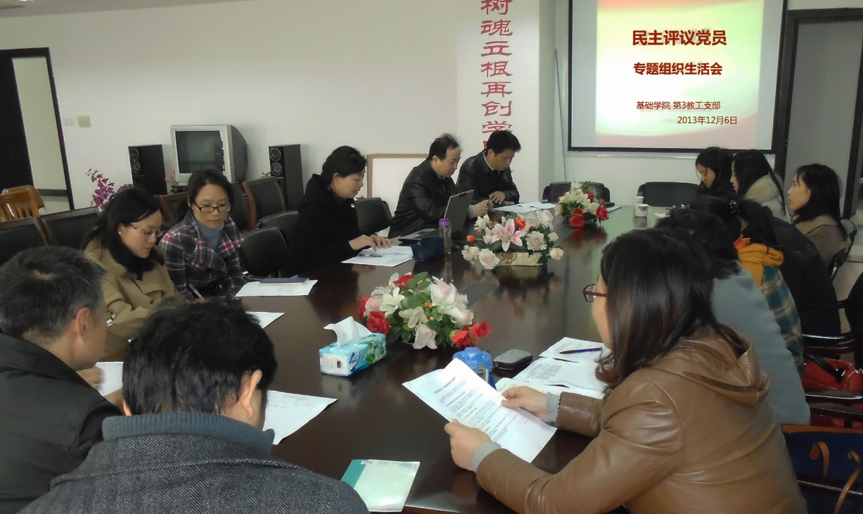12月6日下午,基础教学学院第三党支部在行政楼1308室召开党的群众路线专题民主生活会, 进行民主评议党员活动。基础学院党总支副书记许伯生老师作为学院总支委员莅临会议。